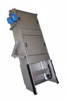ermöglichen die Ausführung als Grob- bzw. Feinrechen sowie den Einsatz als Gerinne oder Behältergerät. Der vertikale Transport des Rechengutes aus dem Gerinne ist sehr platzsparend und arbeitet ohne Spritzwassereinsatz hocheffizient. Eine Verschleppung von Rechengut in nachfolgende Anlagenteile ist konstruktiv ausgeschlossen.